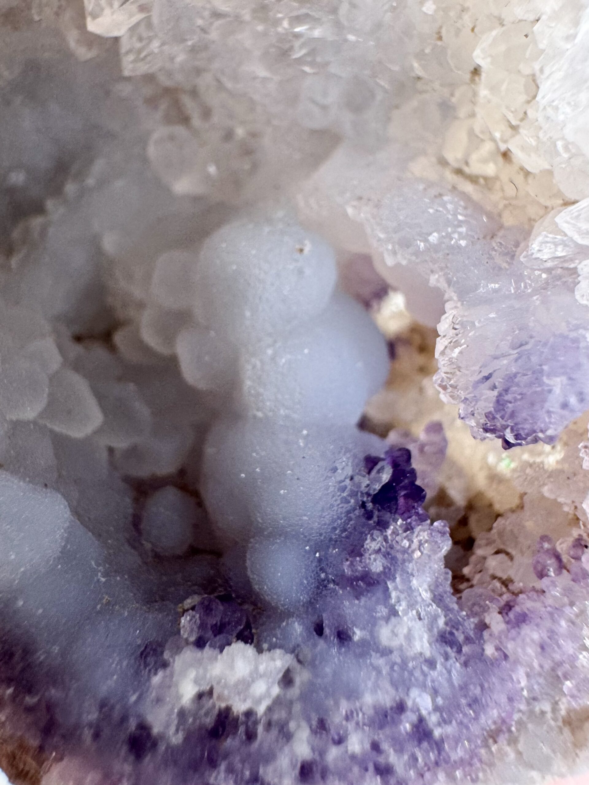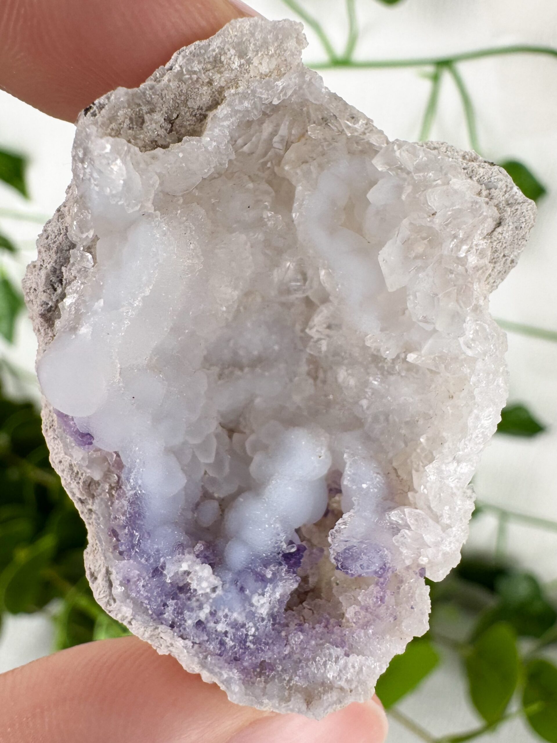 Spirit Flower ist eine besondere Kombination aus Chalcedon, Quarz und lila Fluorit.